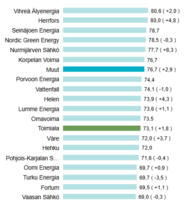 Tutkimuksessa asiakastyytyväisyys mitataan indeksillä 0-100. Alle 60 indeksipisteen tulos tarkoittaa tyytymättömiä, 60-75 tyytyväisiä ja yli 75 indeksipisteen tulos tarkoittaa erittäin tyytyväisiä asiakkaita. Asiakastutkimuksen avulla saamme arvokasta tietoa asiakaskokemuksesta ja asiakastyytyväisyydestä sekä siitä, missä olemme onnistuneet ja mitä voisimme kehittää. Tutkimuksen mukaan asiakkaamme arvostavat erityisesti Seinäjoen Energian luotettavuutta, asiakkuuden vaivattomuutta ja tuotelaatua. Asiakkaamme kokevat myös, että pidämme heistä hyvää huolta.