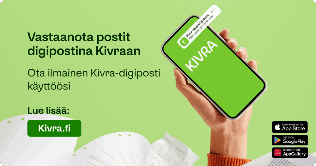 Kivra on ilmainen digipostipalvelu, jolla voit vastaanottaa, maksaa ja arkistoida eri palveluntarjoajien laskuja ja muita dokumentteja. Voit käyttää Kivraa joko verkkoselaimella tai sovelluskaupasta ladattavalla mobiilisovelluksella.